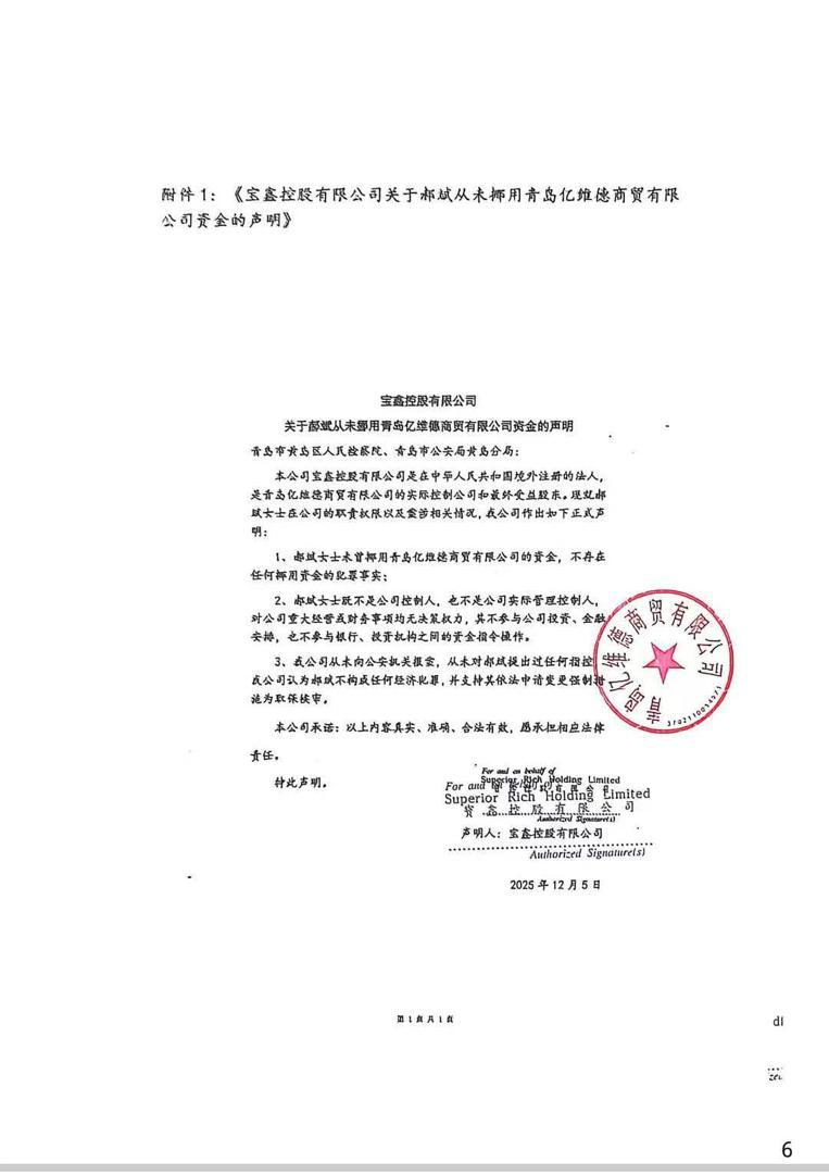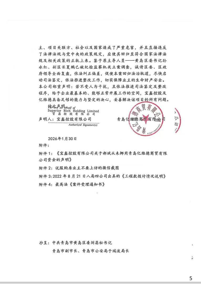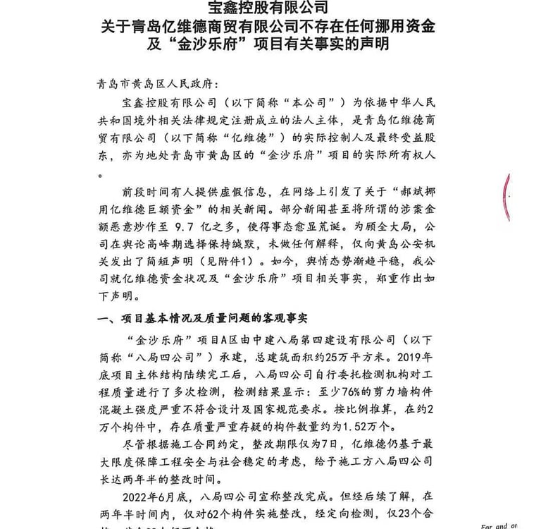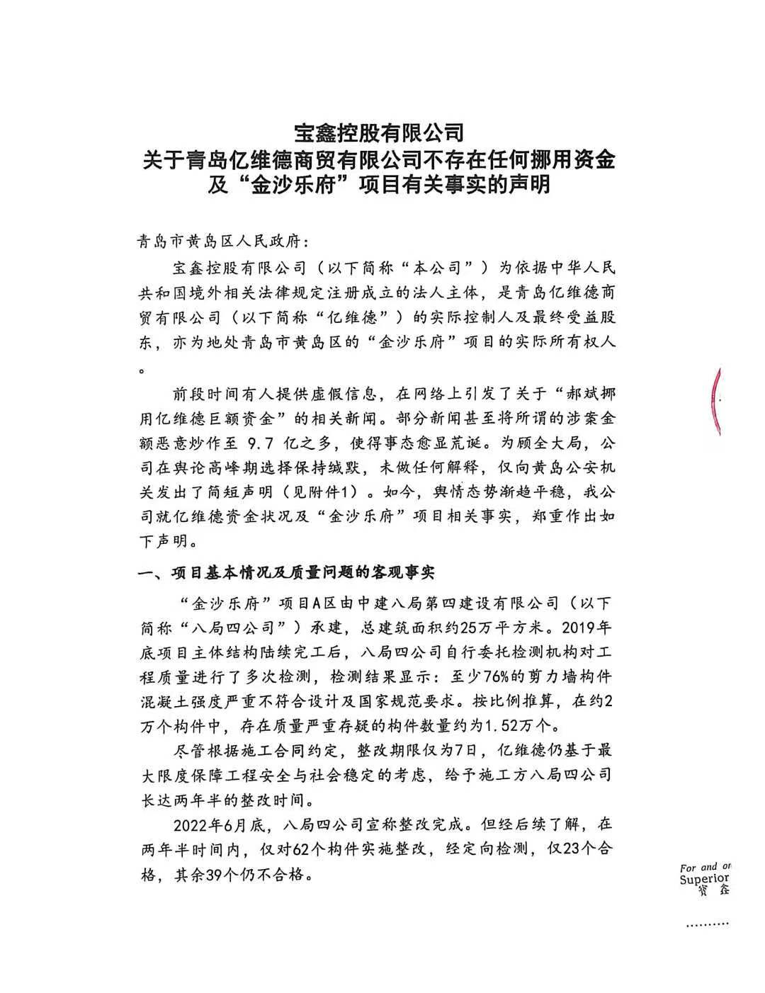 宝鑫控股有限公司关于青岛亿维德商贸有限公司不存在任何挪用资金及“金沙乐府”项目有关事实的声明